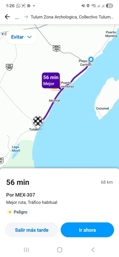From my test point, the Tulum archaeological site is about 56 minutes away. This means that from Tulum’s hotel zone to Tulum Airport, it would take around 45 minutes.