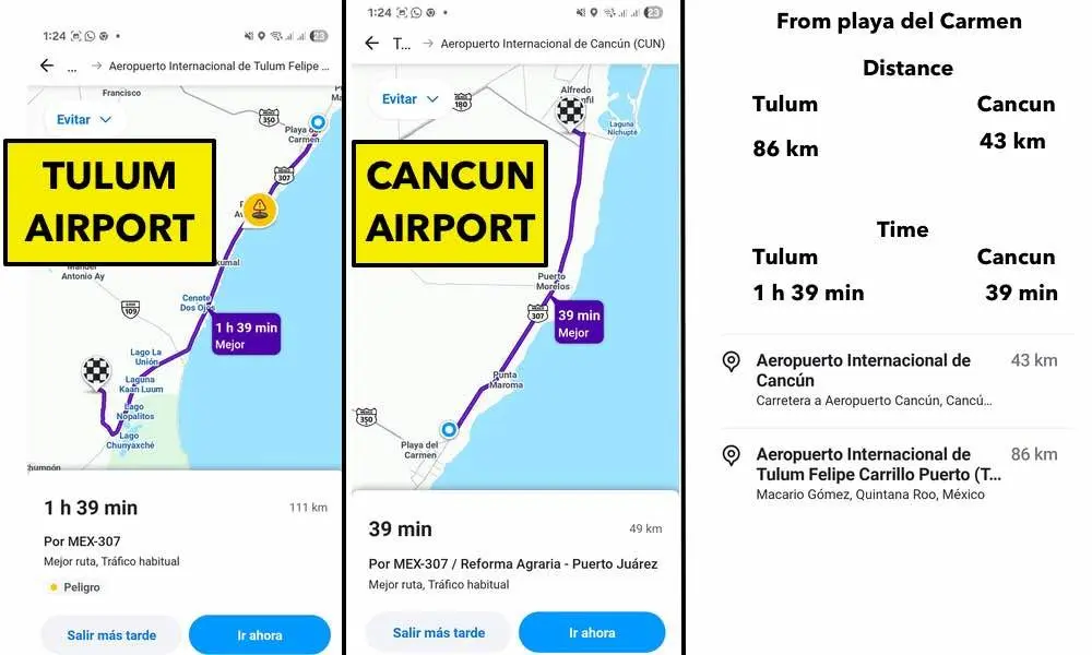 Personally, I measured the distances from Playa del Carmen using Waze: