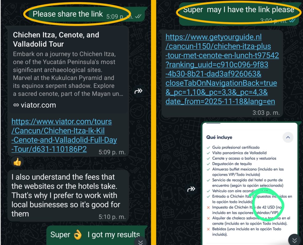 When someone shows me another tour, I always ask for the link. Not to criticize, but to help them identify hidden costs and make a real mathematical comparison instead of comparing illusions. Almost always, I find a fake “tax” of 42 USD to 50 USD dollars per person, even though the tour description claims the entrance to Chichen Itza is already included.